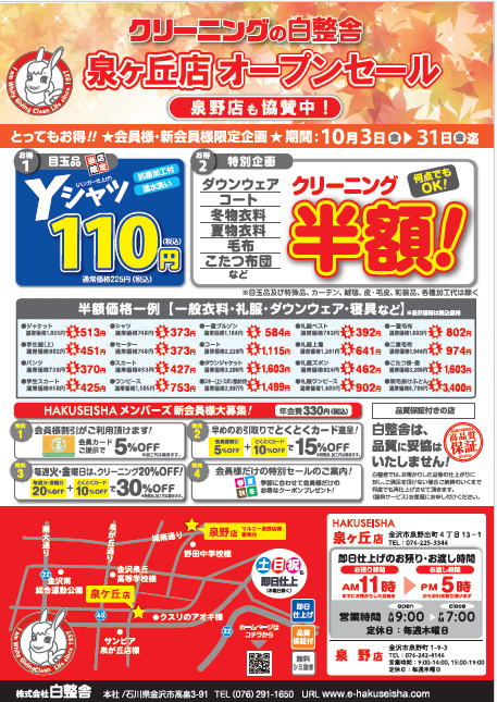 ★オープンセール開催★ 10/3㊎~10/31㊎まで!! ☆一般衣類・寝具クリーニング半額!(^^)! ☆目玉品:ワイシャツ(ハンガー仕上げ)110円♪ 泉野店も協賛中!!