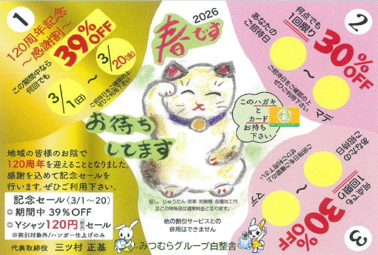 🌸2025年 春セール🌸 ご招待日にクリーニング何点でも30%OFF!! ぜひご利用下さい(^_-)-☆